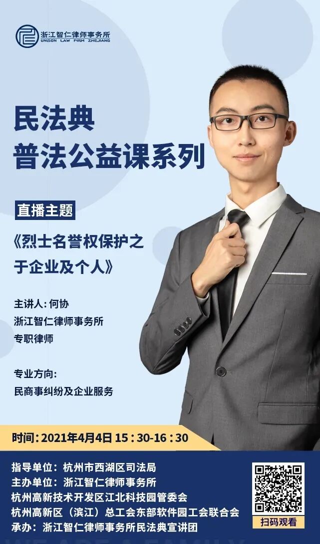 民法典普法公益课系列之《烈士名誉权保护之于企业及个人》,由何协律师主讲。