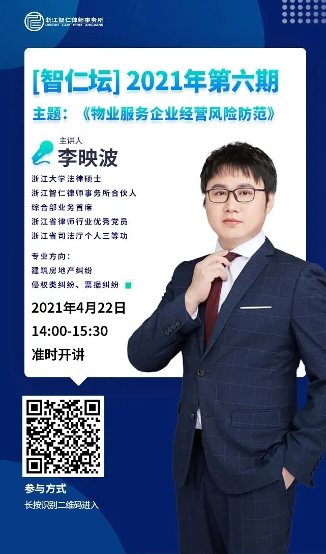 智仁坛第六期《物业服务企业经营风险防范》线上线下同事开讲,由智仁所综合业务部首席律师李映波主讲。