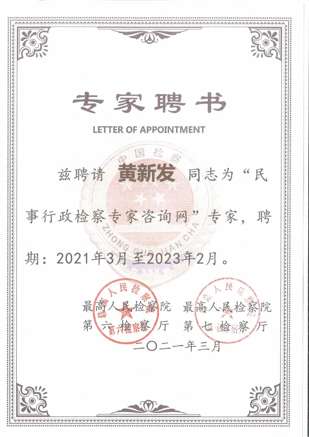日前,最高人民检察院第六检察厅、第七检察厅发放专家聘书,聘请我所执行主任黄新发律师,我所副主任,重整重组部首席律师李斌律师,公司业务部首席律师、工会主席汤云周律师为“民事行政检察专家咨询网”专家,聘期为2021年3月至2023年2月。